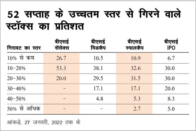 उदाहरण के लिए यह देखने पर कि बीएसई सेंसेक्स, बीएसई मिडकैप, बीएसई स्मालकैप, और बीएसई आईपीओ में 52 सप्ताह के उच्चतम स्तर से कितने स्टॉक्स नीचे गिरे हैं, सभी अलग कहानी बताते हैं। ये हैं नतीजे