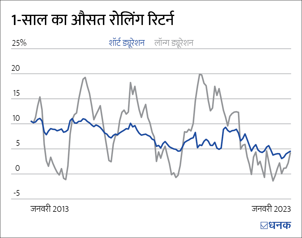 तमाम फ़ंड कैटेगरी का पिछले कुछ सालों का रिटर्न एनेलाइज़ करने के बाद, ये पाया गया कि शॉर्ट-टर्म फ़़ंड, लॉन्ग-टर्म और मीडियम-टू-लॉन्ग टर्म फ़ंड की तुलना में कम तेज़ उतार-चढ़ाव वाले हैं. अगर हम 10 साल के शॉर्ट ड्यूरेशन फ़ंड के एक साल के औसत रोलिंग रिटर्न पर गौर करें, तो पाएंगे कि रिटर्न की रेंज 2.से रही है. इसके विपरीत, लॉन्ग-टर्म फ़ंड काफ़ी तेज उतार-चढ़ाव वाले रहे हैं और इनके रिटर्न की रेंज -1.7% से 20% रही है. वहीं मीडियम-टू-लॉन्ग टर्म फ़ंड की बात करें, तो इन फ़ंड्स ने 1%-15% के बीच रिटर्न दिया है. (1 साल और 5 साल के औसत रोलिंग रिटर्न का ग्राफ़ देखें)