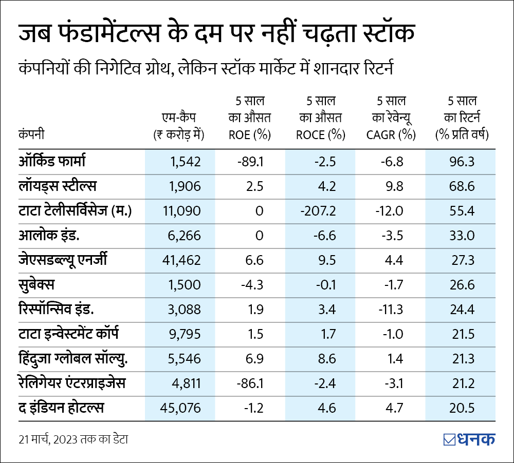 हमने ऐसी कंपनियों के नमूने खोजने के लिए एक सामान्य सा अभ्यास किया है, जिनके फ़ंडामेंटल्स स्टॉक की क़ीमत से मेल नहीं खाते हैं. हमने बीते पांच साल के दौरान औसत से कमज़ोर फ़ाइनेंशियल ग्रोथ वाली, लेकिन स्टॉक मार्केट में शानदार परफ़ॉर्मेंस करने वाली कंपनियों पर ग़ौर किया.