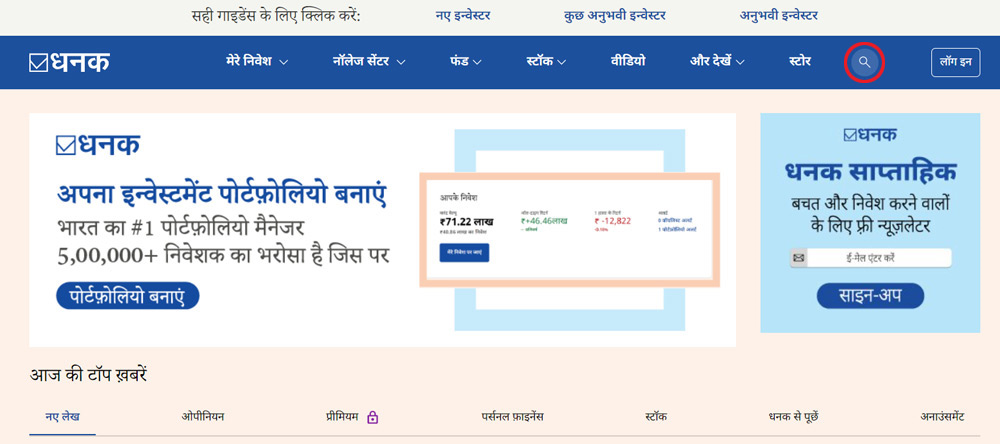 चलिए दो कंपनियां चुनते हैं और उन्हें एनेलाइज़ करते हैं. पहली, जिसके फंडामेंटल्स को मज़बूत हों, और दूसरी कंपनी जिसे कमज़ोर माना जाता है. इसके लिए सबसे पहले धनक वेबसाइट पर जाएं. फिर, सबसे ऊपर दूसरी रो के आखिर में 'सर्च' पर जाकर स्टॉक का नाम लिखकर सर्च करें.