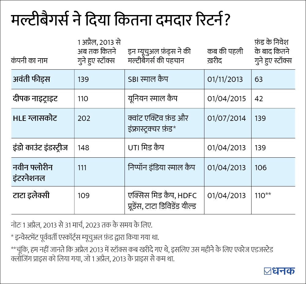 भले ही 1 अप्रैल, 2013 से अभी तक 46 ऐसी कंपनियां रहीं, जो 100 गुनी बढ़ चुकी हैं, लेकिन फ़ंड हाउसेज इनमें से महज़ छह कंपनियों के स्टॉक्स को शुरुआती दौर में ख़रीद सके और कीमतों में दमदार तेजी को भुनाने में कामयाब रहे.