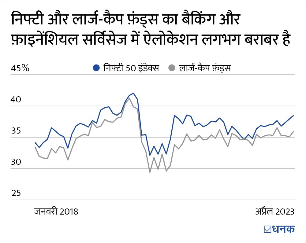 - निफ्टी 50 का एक बड़ा हिस्सा, लगभग 30 से 40 प्रतिशत बैकिंग और फ़ाइनेंशियल सर्विसेज से बना है. ऐसे में बेहतर है कि आप इंडेक्स फ़ंड (index fund) या लार्ज-कैप फ़ंड (large-cap fund) में निवेश करें. इससे आपको फ़ाइनेंशियल सेक्टर में काफ़ी एक्सपोज़र मिलेगा और आपका पैसा दूसरे सेक्टर्स में भी निवेश होगा. इसे डायवर्सीफ़िकेशन कहते हैं, ये एक भरोसेमंद रणनीति है, जो ये सुनिश्चित करती है कि आपके सारे अंडे एक टोकरी में न रहें.